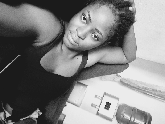 This black and white image depicts an indoor scene in Ado, Nigeria, featuring a single individual. A young adult female with dark skin and dark, curly hair is shown reclining, looking directly towards the viewer with a neutral expression. She wears a dark-colored sleeveless top. Her left arm is bent, with her hand resting on her head. The background on the right side of the frame includes a water dispenser, silver in appearance, with a large inverted plastic water bottle mounted on top. The dispenser has visible spigots and a control panel. To the left and behind the individual, a plain, light-colored wall is visible. A light-colored curtain, appearing tied, hangs vertically in the background on the right, behind the person's left arm and adjacent to the water dispenser. The individual appears to be leaning against a dark, possibly cushioned surface.