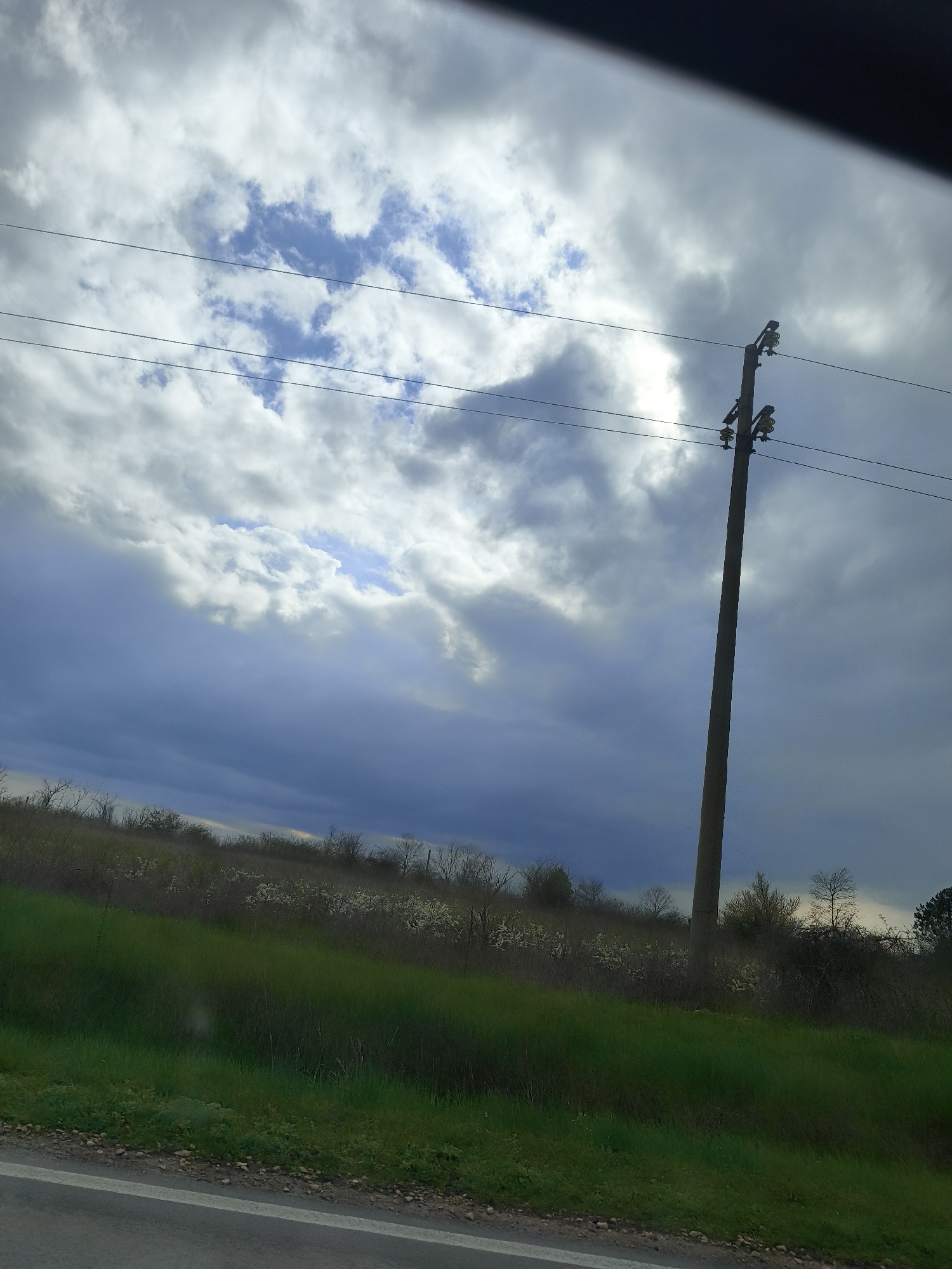 The image depicts a roadside scene in what appears to be a rural area near Benkovski, Bulgaria. A concrete utility pole stands prominently on the right side of the frame, with power lines stretching across the sky. The sky is dominated by cloudy formations with patches of blue visible. In the mid-ground, there is a grassy field, and beyond that, a row of trees and vegetation lining the horizon. The image is taken from a slightly elevated position, potentially from a car or higher vantage point on the side of the road, with part of the car's interior visible at the top.