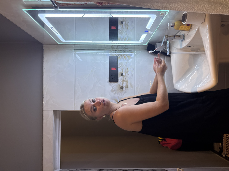 A woman stands in a bathroom with white and gray tiled walls, washing her hands at a white sink. A lighted mirror hangs above the sink, and a power outlet is visible on the wall. The woman is fair-skinned with blonde hair and wears a black sleeveless dress. A patterned rug is partially visible at the bottom right of the frame. The bathroom interior features neutral tones and simple decor.
