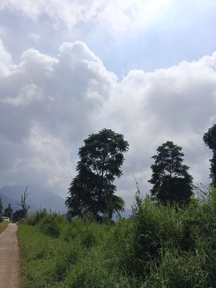 The scene depicts a rural landscape within the city of Nam Sa Lat, Myanmar. A narrow, light-colored path, likely dirt or gravel, extends from the lower-left foreground into the background, curving slightly to the left. The path is bordered on both sides by dense, tall green grass and uncultivated vegetation. In the midground, two large, leafy trees with dark green canopies stand prominently towards the right. Further along the path on the left, a bare, desiccated tree trunk with skeletal branches is visible. In the distant background, a range of mountains or hills appears hazy. A white vehicle is partially visible on the distant section of the path. The sky is largely overcast with large, white and grey cumulus clouds, though a patch of lighter blue sky with visible sunlight is present towards the top center. No individuals are depicted.