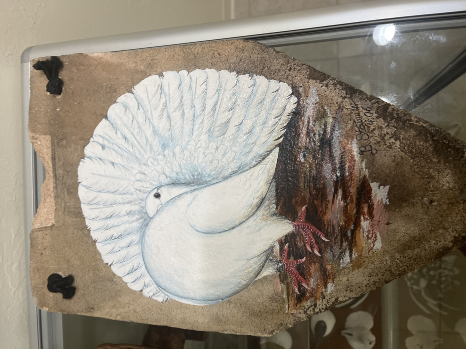 The scene displays a piece of artwork in an indoor setting. The artwork is a painting on an irregularly shaped, earthy-brown, textured substrate, possibly a piece of rock or similar natural material. The top edge of the substrate is rough and uneven, with two dark, raised fasteners, one on the upper left and one on the upper right. The central subject of the painting is a white fantail pigeon with a large, fanned tail, rendered in white and subtle light blue hues for its feathers. The pigeon is depicted from a slightly rear-right perspective, with its head turned to the left, revealing one dark eye. Its feet are red with visible claws, and a silver band is present on its left leg. The bird stands on a dark brown, textured surface, suggestive of a log or uneven ground. In the lower right quadrant of the painting, a signature "B. Strouse" (or similar) and the date "4-06" (April 2006) are handwritten. The artwork is positioned vertically, and its right side is bordered by a silver-colored frame and glass, indicating it is likely within a display case or cabinet. Reflections are visible on the glass surface. The background consists of a light-colored wall or ceiling. No individuals are present in the frame. No specific geographic landmarks or identifiers are discernible within the image to determine a precise location in Oklahoma City, United States.