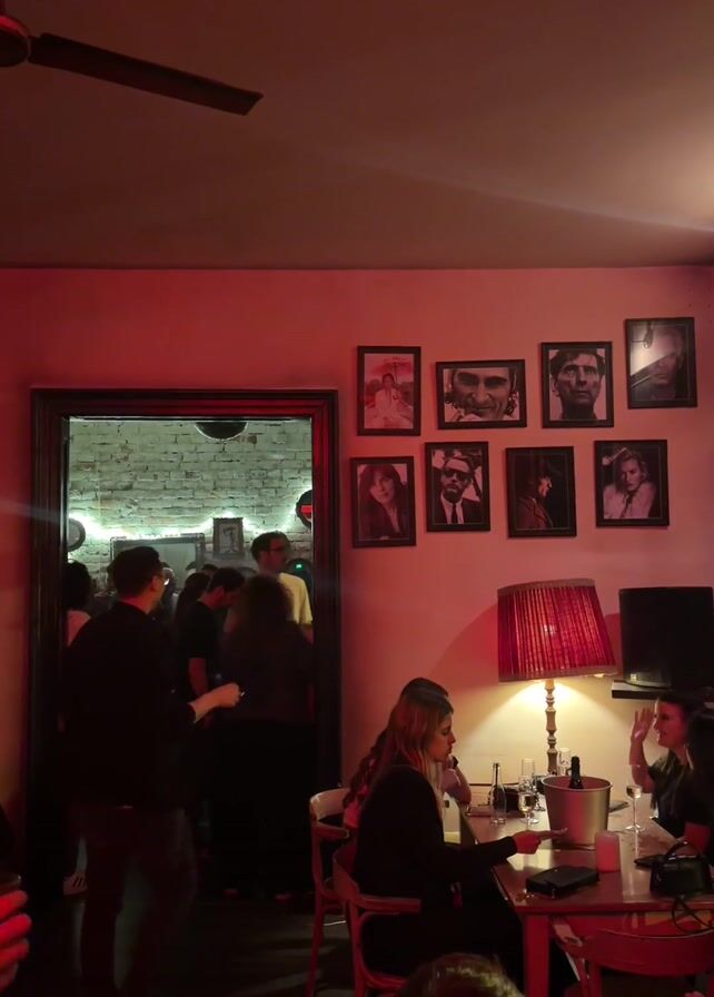 crowded, dimly lit bar with red-tinted lighting. In the foreground, three people are seated at a small round table with wine glasses, a bottle of wine in an ice bucket, and other items. Behind them, a wall is decorated with framed black and white pictures of various people. Through an open doorway, a larger, more crowded room can be seen, where many people are standing and socializing. A man in a black shirt reaches out to shake hands with one of the women at the table. A ceiling fan is visible above. The atmosphere appears lively and social.