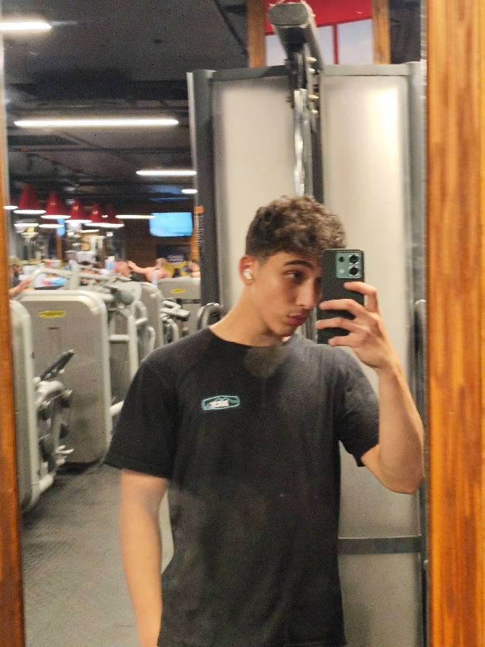 The image displays a mirror selfie of a young male situated within a gym