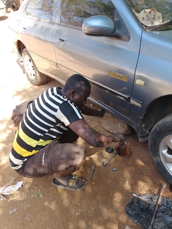 The image depicts an outdoor vehicle repair scene in Yelwa, Nigeria