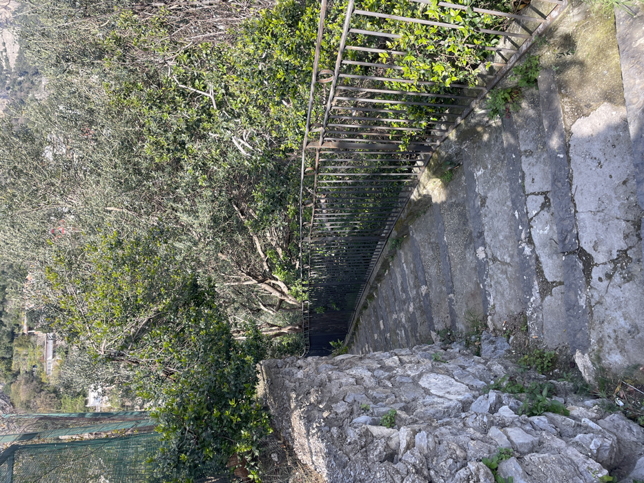The image captures a descending outdoor stone stairway situated in Arienzo, Italy