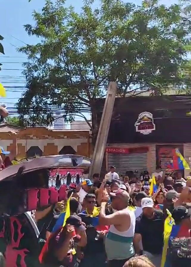 A crowd of people are celebrating in the street, waving Venezuelan flags. A man is standing on top of a car that has speakers in the open trunk. The car has a pink and black design inside. The crowd is excited and enjoying themselves. Buildings are visible in the background of the scene. The weather is sunny.