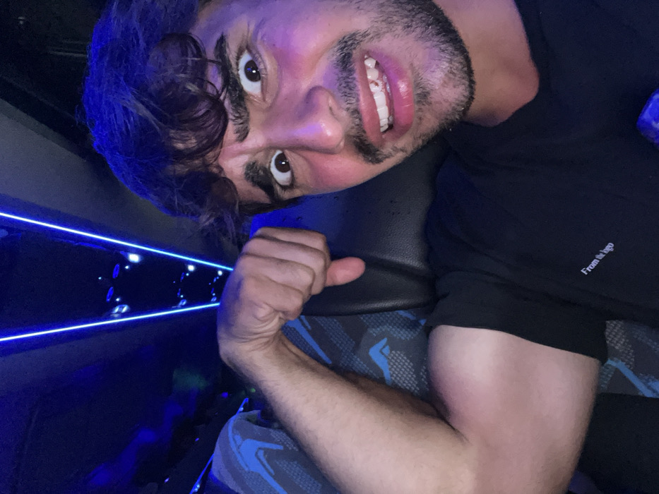 A man with dark curly hair, a beard, and brown eyes is smiling, showing his teeth. He wears a black t-shirt with white text. He's inside a vehicle with blue LED lights visible along the sides. He sits in a seat with a grey and blue patterned cover. His right arm is bent, forming a fist near his shoulder. The overall image is brightly lit with a slightly tilted angle.