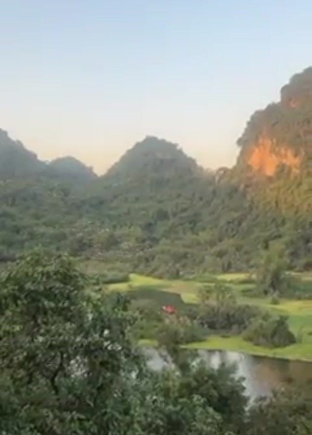 panoramic view of a tropical landscape with lush green hills, a body of water, and clear sky. The hills are covered with dense vegetation, and the water reflects the sky. A red boat is visible on the water. The lighting suggests it is either early morning or late afternoon.