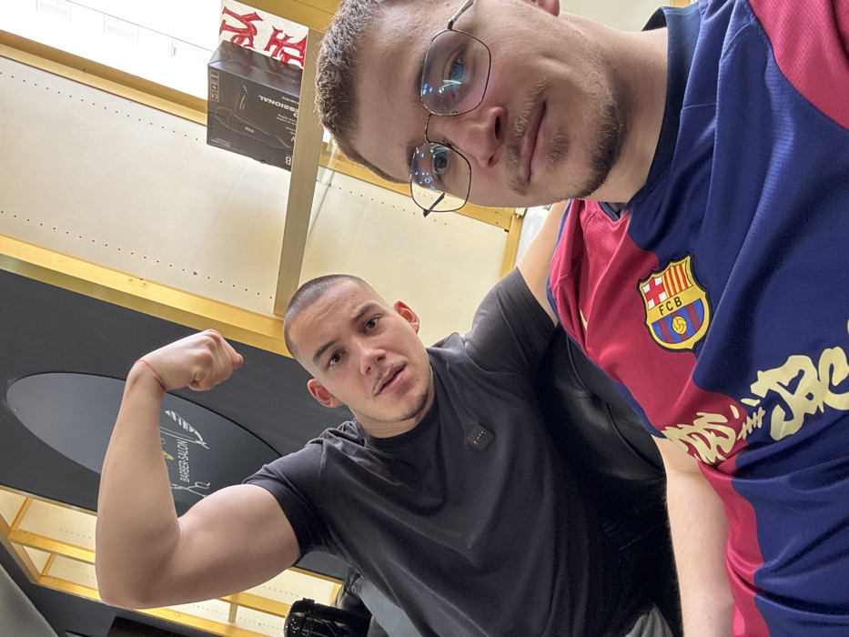 This image captures two males inside a modern barbershop in Krems an der Donau, Austria. In the foreground, on the right, a male with short light brown hair, a trimmed beard, and metal-framed glasses is positioned, holding the camera. He is wearing a blue and red FC Barcelona soccer jersey with gold lettering on the blue section. Behind him, to the left, a second male with a buzz-cut hairstyle and a mustache is seated on a dark, possibly leather, chair or couch. He is wearing a dark gray short-sleeved t-shirt and is flexing his left bicep, with his fist clenched. Both individuals are looking directly at the camera. The background reveals typical barbershop elements: a large, dark oval sign or mirror on the left displaying "BARBER SALON" in white text alongside a barber pole graphic. To the right, a shelving unit with gold-colored vertical supports and light-colored shelves holds various retail hair products, including boxes labeled "MOWB PROFESSIONAL" and a red bag with white Japanese characters. A window, showing bright external light, is visible beyond the shelving.