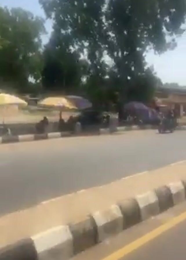 view from a moving vehicle, driving along a paved road with a yellow dividing line and a curb with alternating black and white blocks. On the side of the road are trees and buildings with people and vehicles parked along the street. A motorcycle drives on the opposite side of the road. Power lines are visible in the sky.