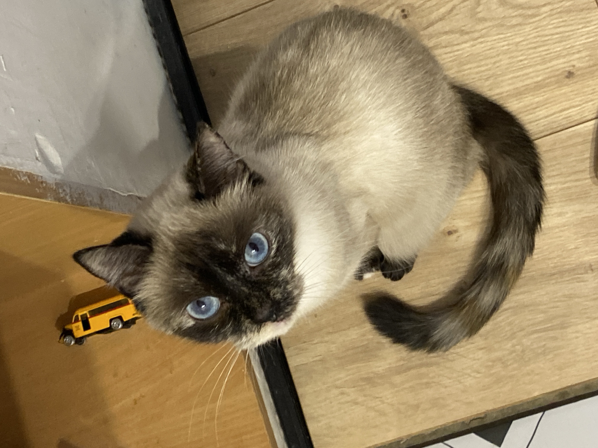 An indoor scene within a residential setting in Chaikovsky, Russia, depicts a single feline subject positioned on a light brown wooden floor. The cat exhibits point coloration, characterized by a dark brown/black face, ears, paws, and tail, contrasting with a light cream/tan body. Its prominent eyes are a vivid blue. The cat is seated upright, facing towards the upper left of the frame, with its head slightly tilted upwards and to its left. Its tail is curled on the floor to its right. Adjacent to the cat's upper left, a small yellow toy car, possibly a replica of a taxi or utility vehicle, is visible lying on its side on the wooden floor, positioned against a vertical wooden surface. The floor planks display visible grain and seams. In the background, a dark horizontal baseboard or door frame separates the wooden floor from an off-white, textured vertical wall surface, which shows some irregularities. No other individuals or direct interactions are visible.