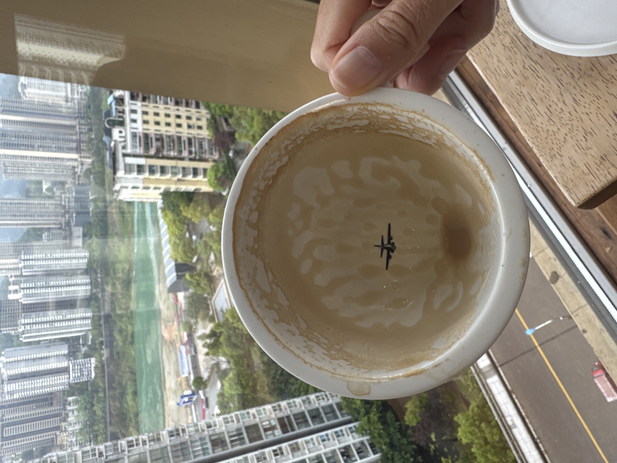A top-down, eye-level, medium shot depicts a white ceramic coffee mug held in a person's hand, with the dregs of coffee remaining inside. Floating in the coffee sediment, there's a small, silhouetted airplane-like form. The view from the window behind the mug reveals an urban landscape. Multiple high-rise residential buildings are clustered together, interspersed with greenery. A river bisects the scene, and a road runs alongside one edge of the buildings. The scene appears to be in Wulong District, Chongqing, China, based on the architecture and landscape. The mug sits next to a dark wooden surface, possibly a table or windowsill.