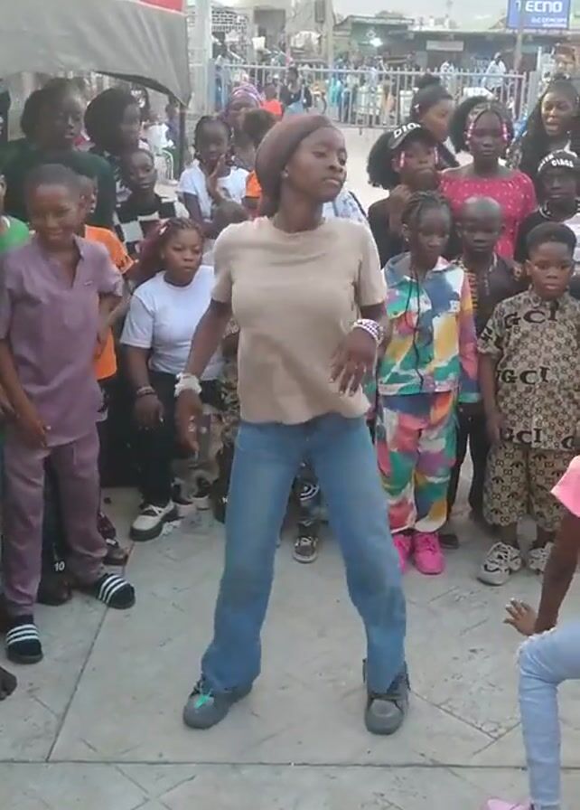 A woman dances in front of a crowd of children and some adults. The woman in the foreground is wearing a light brown t-shirt and blue jeans with gray sneakers. Behind her, a large group of children stands watching, dressed in a variety of colorful outfits. To the right, another woman with long, red curly hair wearing a brown and orange patterned dress joins in the dancing, though partly obscured. The setting appears to be an outdoor public space with a few buildings in the background, and a banner with the word "TECNO" visible atop one of the structures. The video is shot from a close perspective, with the camera occasionally shaking slightly.
