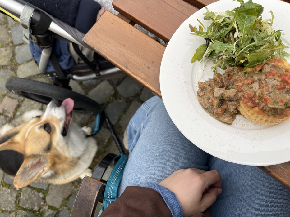 An overhead view captures a scene at an outdoor dining area in Meisenheim, Germany. In the foreground, a white circular plate holds a meal consisting of two puff pastry shells, each filled with a creamy stew containing diced meat, mushrooms, and red bell peppers, accompanied by a portion of mixed green salad. The plate rests on a wooden slatted table. To the immediate left, the lower arm, clad in a brown sleeve with a light blue cuff, and the lap of a person wearing light blue denim jeans are visible. A turquoise dog leash with a black handle is draped over the person's lap. Beyond the table, on a cobblestone ground, a tri-color Pembroke Welsh Corgi dog sits attentively, looking upward towards the table with its tongue slightly extended. Adjacent to the dog, the front wheel and frame of a stroller or mobility aid are discernible.