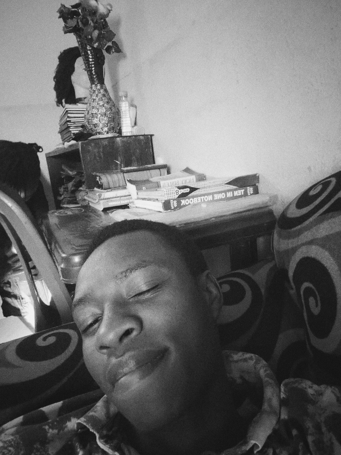 A black and white image depicts an adult male reclining indoors in Narayi, Nigeria