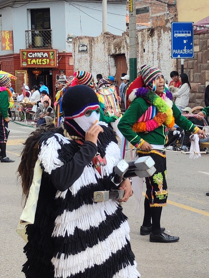 A street scene captures people in vibrant traditional attire. One figure in the foreground wears a black and white fringed costume and a balaclava, holding a pair of concrete blocks. Another figure behind is adorned with a colorful garland and an embroidered green jacket. In the background, a "Chifa Tausi" restaurant and a blue bus stop sign are visible, adding to the bustling atmosphere. Spectators are gathered in the backdrop, observing the colorful procession.
