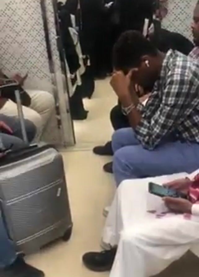 The scene is set inside a moving subway car. Several people are visible, mostly seated, and some standing towards the back. The seated passengers are occupied with their phones or appear lost in thought. One individual is wearing a plaid shirt and has wireless earbuds in. He has his hands on his head. Another seated person is wearing traditional white clothing. Luggage sits next to one of the passengers. Most of the standing passengers in the background are wearing black abayas. The subway car has a light interior with patterned walls. An automated announcement can be heard, stating the next stop is the National Museum.