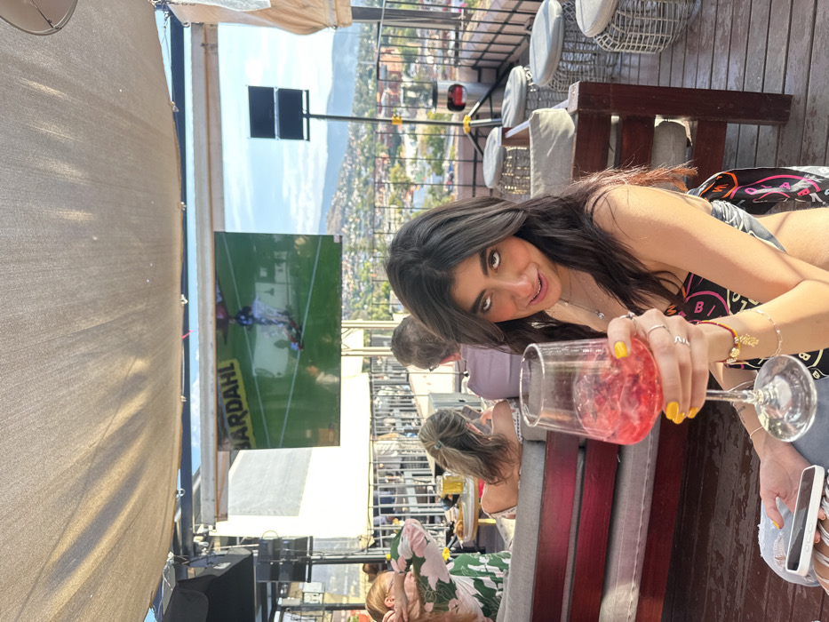 A woman with dark hair holds a wine glass filled with a pink beverage. She sits at a rooftop bar with other people. A television screen displays a sports game in the background. The scene overlooks a town and landscape. The woman's nails are painted yellow and she wears several bracelets. There are tables and chairs nearby. A large awning provides shade, and a black speaker sits near the table.