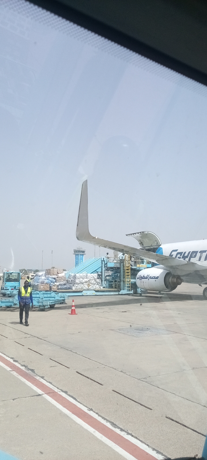 The image displays an airport tarmac scene, viewed through a window exhibiting slight reflections. A white aircraft, identified as EgyptAir by the blue "EGYPTAIR" text on its fuselage and "مصر للطيران" (EgyptAir) in Arabic script on the engine cowling, is parked. Its forward cargo bay door is open. A blue-colored cargo loader is elevated and positioned against the aircraft's open cargo bay, with cargo visible on its platform. Several blue baggage carts are present on the tarmac, loaded with various packages, some covered in white netting or tarpaulins. A tug vehicle is partially visible on the far left, near additional baggage carts. One individual in a dark uniform and a high-visibility yellow-green vest walks across the foreground tarmac from left to right. Another individual is visible on the elevated platform of the cargo loader. An orange traffic cone rests on the tarmac to the right of the walking individual. The tarmac is grey concrete, featuring a prominent red and white painted line and black dashed lines. In the background, a light blue control tower with a darker blue top section is visible. The sky is clear and light blue, indicating daytime. The location is an airport tarmac in Unknown, Unknown.