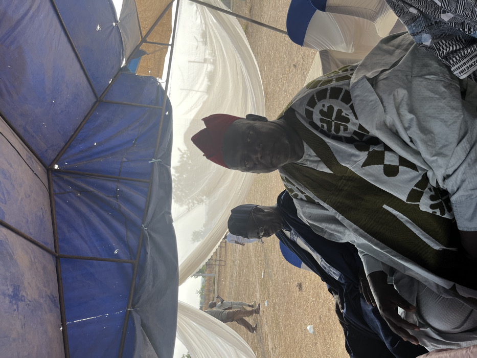 The image captures an outdoor scene in Ajikemai, Nigeria, beneath a temporary canopy structure