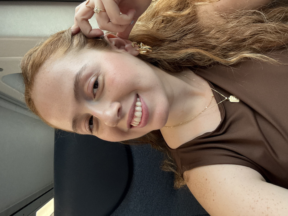 The image displays a head and upper torso shot of an adult female in an indoor setting. She has fair skin, reddish-brown hair, and is smiling directly at the camera, revealing her teeth. She wears a brown sleeveless top. Her left hand is raised near her right temple, with fingers touching her hair. On her right ear, she wears multiple gold-colored earrings, including a prominent hoop and a smaller, possibly mushroom-shaped earring. Around her neck are two layered gold-colored chain necklaces, one featuring a small, rectangular pendant with a raised 'E' motif. A ring with a multi-stone cluster design is visible on her right ring finger. The background consists of a dark grey padded seat with a headrest and an overhead panel with a linear light source, indicating the interior of a public transport vehicle, such as a train or bus. No specific visual identifiers within the image confirm its location as Harrison, United States.