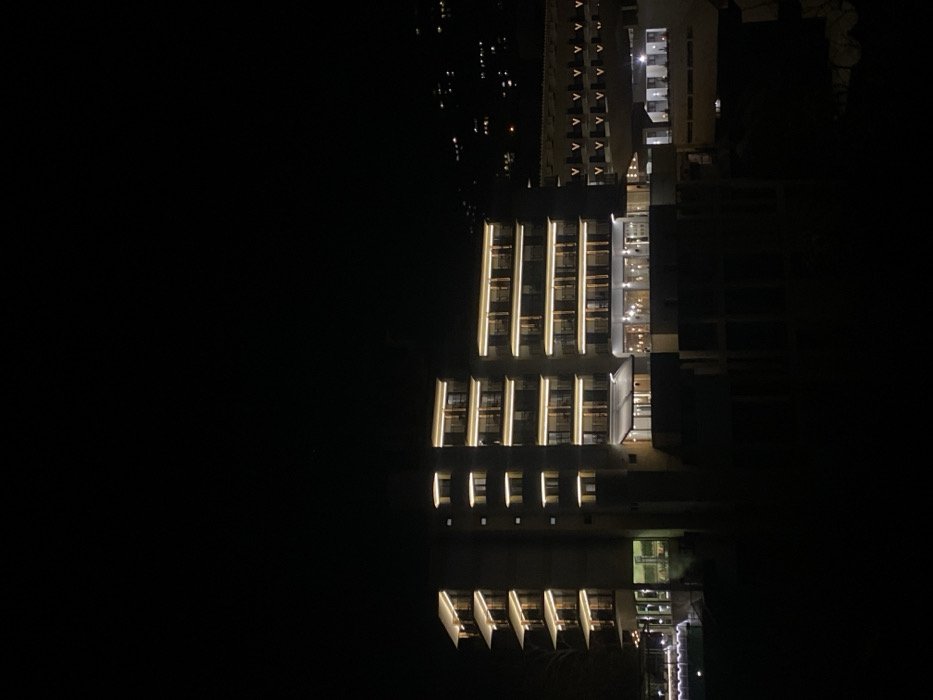 The scene captures a prominent, multi-story building complex illuminated at night in Veliko Tarnovo, Bulgaria. The primary structure is a six-story edifice, characterized by a modern architectural style. Each floor features balconies uniformly illuminated by warm-toned linear strip lighting. The leftmost section of the building incorporates distinct angled white architectural elements above its balconies. The ground level presents expansive windows, revealing illuminated interior spaces with visible light fixtures, suggesting dining or lounge areas. To the immediate left, a section of an outdoor area, possibly a pool deck, shows diffuse white lighting. An adjoining building to the right, of a lower elevation, exhibits a series of white, V-shaped parapet elements along its roofline and also features illuminated windows. The distant background reveals scattered lights on a dark hillside, indicative of urban development. The sky is dark, and the immediate foreground is obscured by shadow. No persons are visible.
