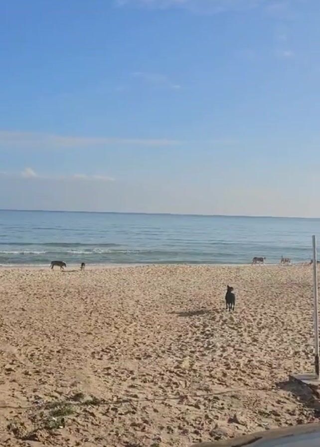 The scene is a beach on a sunny day, with a clear blue sky and a calm sea. Several dogs are on the beach; a black dog is standing still in the foreground, while two light-colored dogs are walking near the water's edge. The sand is golden, and there are footprints covering it. To the right of the frame, there is a white pole and a glimpse of a black car.