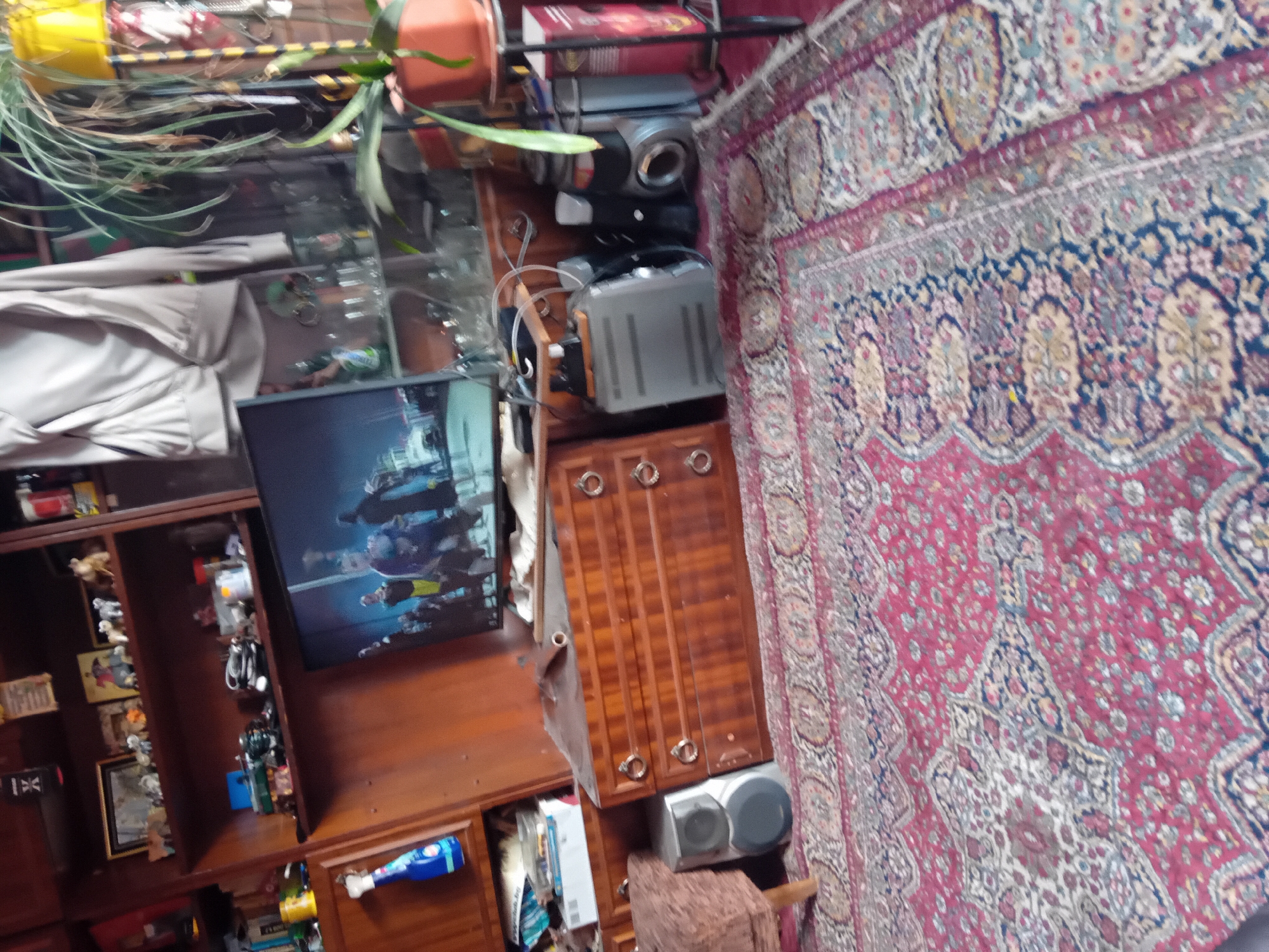 cluttered living room. There is a large oriental rug taking up a significant portion of the frame. A wooden entertainment center is visible, housing a television with figures displayed on the screen. Various objects, including decorative items, books, and a cleaning bottle are seen on the shelves. Electronic devices like speakers and a projector are present on or near the entertainment center. A potted plant hangs above the setup. The location is unknown, and there is no way to confirm the city of Provadia, Bulgaria, from the visual information provided. There is no evidence of any people, subjects, or actions.