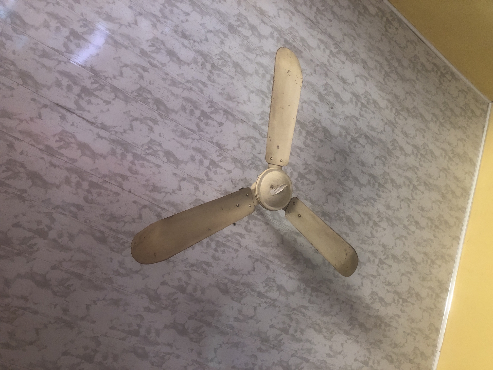 The scene, located in Rido, Nigeria, depicts an overhead view of a three-bladed ceiling fan installed against a patterned ceiling. The fan's three blades and central housing are light beige/tan, showing visible dirt accumulation and dark spots. The fan is stationary. The ceiling consists of light grey panels with a darker grey, mottled, irregular pattern, and faint diagonal lines suggest panel seams. A section of a yellow wall, separated from the ceiling by a white trim, is visible along the bottom edge of the frame. No individuals or specific actions are observed.