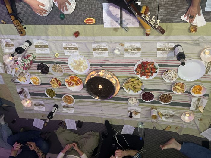 A top-down view showcases a communal meal arrangement on a striped cloth, likely on the floor. Plates hold various foods, including fruit slices, strawberries, nuts, dates, and beans. Wine bottles and candles are interspersed between plates. Printed cards with Hebrew text are placed along the cloth. People sit around the setup with feet, legs, and hands visible. A guitar lies at the top left of the frame, suggesting a relaxed, informal gathering.