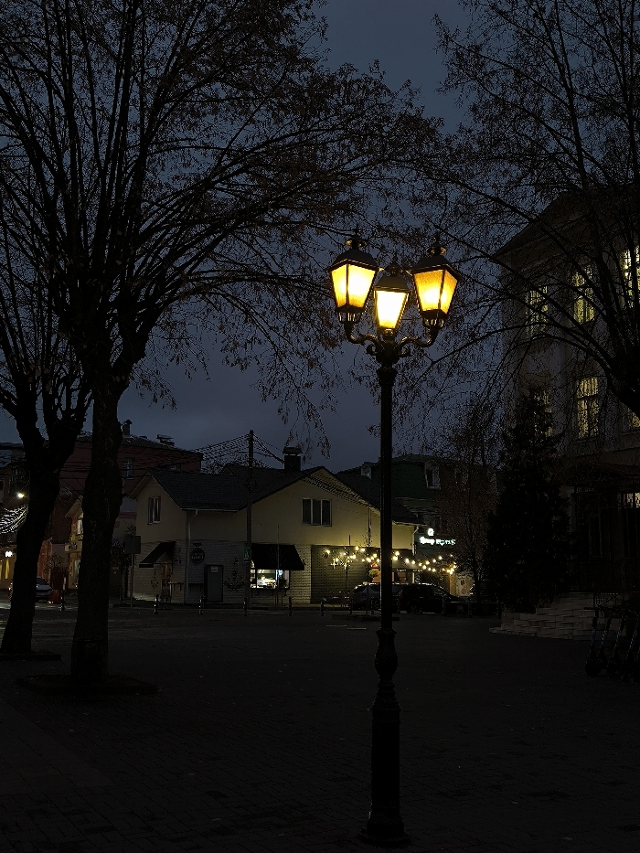 An outdoor scene captured at dusk or night in Vinnytsia, Ukraine, specifically near European Square. The foreground is dominated by a dark, ornate street lamp featuring a central pole with three amber-lit lanterns radiating warmth. The paved ground beneath the lamp is dark, with subtle variations in tone. To the left, several bare-branched deciduous trees, silhouetted against the dim, dark blue-grey sky, indicate late autumn or winter. In the background, a cream-colored, two-story building with a dark-tiled roof is visible, featuring multiple windows and an awning over one. Adjacent to this building on the right, another commercial establishment displays a sign with Cyrillic text, "Вінницький Квас" (Vinnytsky Kvass), and is decorated with multiple strings of warm yellow incandescent lights. Another building with an illuminated window is partially visible further left in the background. A multi-story building with several illuminated windows can be seen on the far right. No individuals are present in the image.