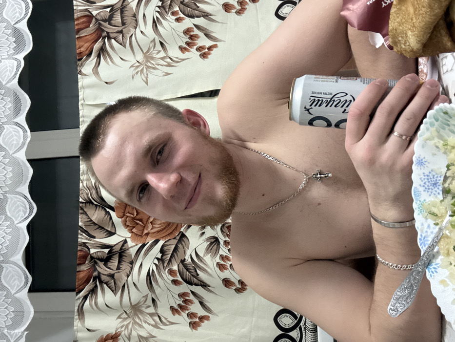 A man with a short haircut and a beard, lies on a bed with a floral pattern. He wears a silver chain with a cross pendant and a silver bracelet. He smiles at the camera while holding a white can of beer. A plate of salad and a fork are visible. There's also a window with a lace curtain on the left.