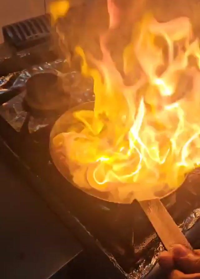A person is cooking in a kitchen, with a gas stovetop visible. A pan with food in it is on fire, with large flames engulfing the food. The person then extinguishes the flames, leaving behind cooked pieces of meat in the pan. The stovetop is covered in aluminum foil, and a large metal pot is visible in the background.
