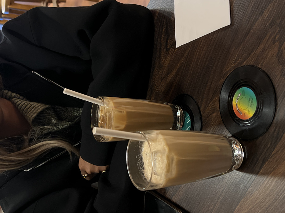 The image captures a close-up perspective of a person seated at a dark wooden table in an indoor setting. The individual, seen from the chest down, wears a black zippered jacket over a ribbed olive-green sweater; light brown hair is visible. Rings are present on the fingers of the person's left hand. Two tall glasses containing an iced, light-brown beverage with white straws are prominently featured. The closer glass has a frothy top layer. Both glasses rest on black, vinyl-record-shaped coasters; the foreground coaster displays a colorful 'Spectrum Records' label. A dark smartphone is partially visible on the table's left edge, and a white folded paper napkin lies to the right. The blurred background indicates a cafe or lounge environment with indistinct seating. The specific location within Paris, France, is not ascertainable from the visual evidence.