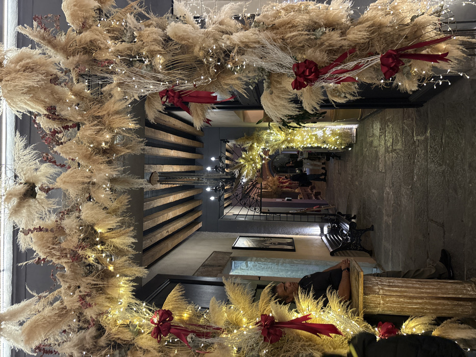 A man is reclining on a decorative plinth. He is framed by a festive archway of pampas grass, adorned with fairy lights and red ribbons. The room behind features exposed wooden beams on the ceiling, a chandelier, a staircase, and a bench along the stone wall. Additional decorations and people are visible in the background.