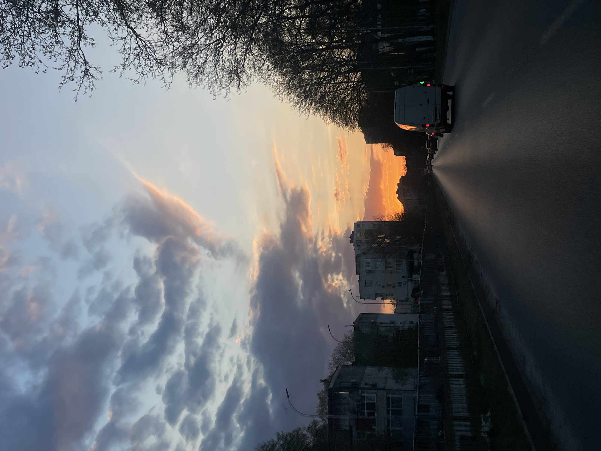 Captured at dusk or dawn, the image presents a street in Varna, Bulgaria. The street runs right, leading into the distance with a white van and other vehicles visible. Buildings of varying heights line the street on the right. A strip of greenery separates the road from the buildings. A line of trees borders the left side of the street and above it is the sky, filled with clouds. Some of the clouds are illuminated with a soft golden light from the sun, while others are darker. Bare branches of trees are visible at the top.