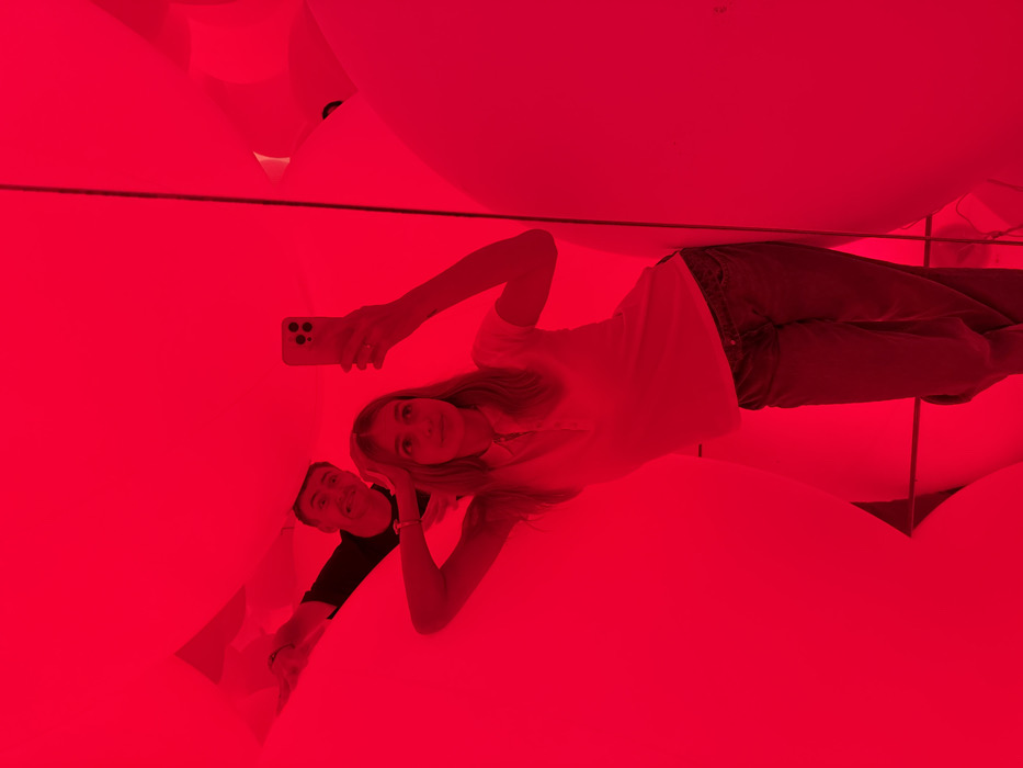 An interior scene depicts two individuals within an immersive art installation, identifiable by its vibrant red lighting and reflective, soft, spherical elements, characteristic of exhibits such as those found at teamLab Planets TOKYO in Koto, Japan. The environment is saturated with intense red light, illuminating large, reflective, and possibly inflatable spherical or irregular shapes that create a distorted and expansive sense of space. Surfaces appear highly reflective, contributing to multiple reflections of the subjects and environment. In the foreground, a young adult female with long, light-colored hair, wearing a light-colored polo shirt and dark trousers, is positioned. She holds a light-colored smartphone with multiple camera lenses in her right hand, extended upwards, actively taking a selfie and looking towards the screen. Her left arm is bent, with her hand near her head. Her body is slightly angled, leaning against a soft, red-illuminated object. Behind and partially to the left of the female, an adult male with short, dark hair, wearing a dark long-sleeved shirt, is visible, possibly as a reflection or positioned behind her. His right arm is extended upwards and outwards, and he displays an open-mouthed expression, looking towards the camera. The primary action involves the female taking a photograph of herself and the male within the unique, artificially lit art installation, with the male posing for the shot.
