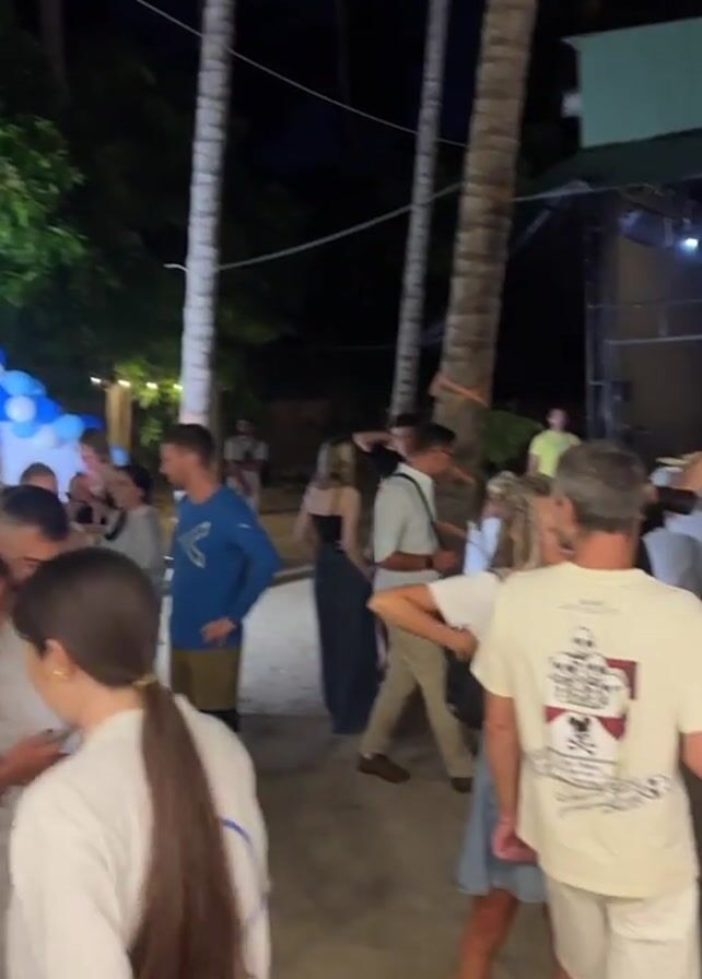 The video showcases an outdoor event at night. The setting appears to be near a beach, identifiable by palm trees. Many people, dressed in casual attire, can be seen mingling. In the background, there's a stage structure with lighting equipment and a screen, potentially for presentations or performances. Tables and chairs are scattered around, suggesting a seated event or lounge area. A photographer with a reflector is visible, indicating documentation or photography of the event is taking place. The presence of balloons and decorations points toward a celebration or special occasion. People are seen in groups, talking and observing the activity.