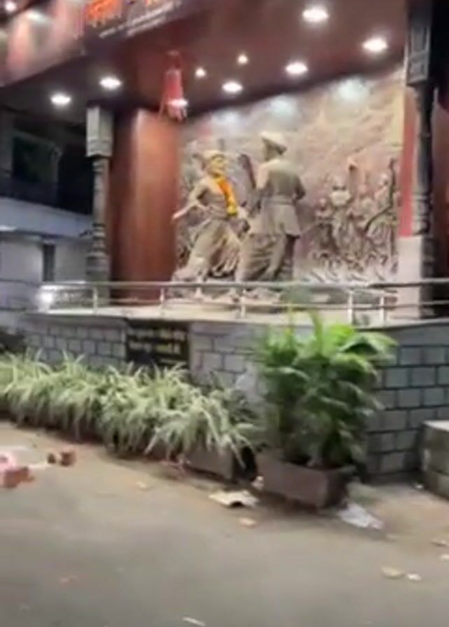 The video depicts a street scene at night. There is a statue of two figures on a raised platform illuminated by overhead lights. The statue appears to be of historical or cultural significance. There is a rangoli design on the street near the statue. The street is lined with parked motorbikes and scooters. A man on a blue and white motorcycle drives past. Other people are visible on the street. A truck is parked along the side of the street. There are some buildings with lit windows visible in the background.