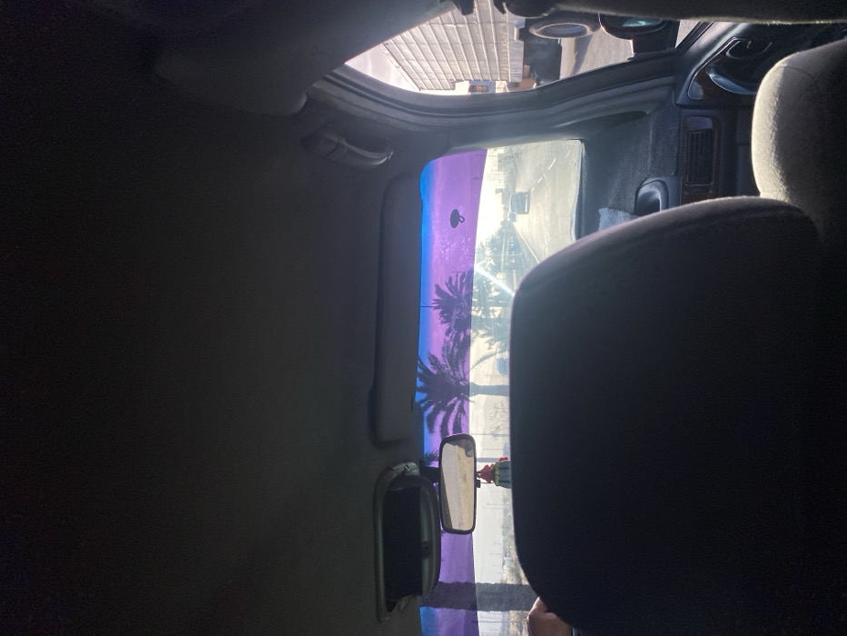 The scene is observed from inside a vehicle, positioned in a rear passenger seat, looking forward through the windshield onto a highway in La Cruz del Pastel, Venezuela. The vehicle's dark grey headliner occupies the upper portion of the frame. A dark grey driver's seat headrest is prominent in the lower center foreground. A rearview mirror hangs centrally, with a small red and white decorative object suspended from it. The upper windshield features a wide, iridescent purple-blue tint band, to which a small dark, looped object is adhered on the right side. The driver's left hand is visible on the steering wheel on the far left. Beyond the windshield, a multi-lane paved road extends under direct, bright sunlight, indicative of a morning or late afternoon setting. Numerous palm trees line the roadside, silhouetted against the bright sky and the windshield's tint. The distant landscape reveals arid terrain with low-lying hills under a clear sky. Other vehicles are present on the road: a light-colored sedan is visible in the distance, and the right side of a large white semi-truck occupies an adjacent lane to the vehicle's immediate right. Portions of the vehicle's dashboard, including air vents and a textured mat, are visible beneath the windshield.