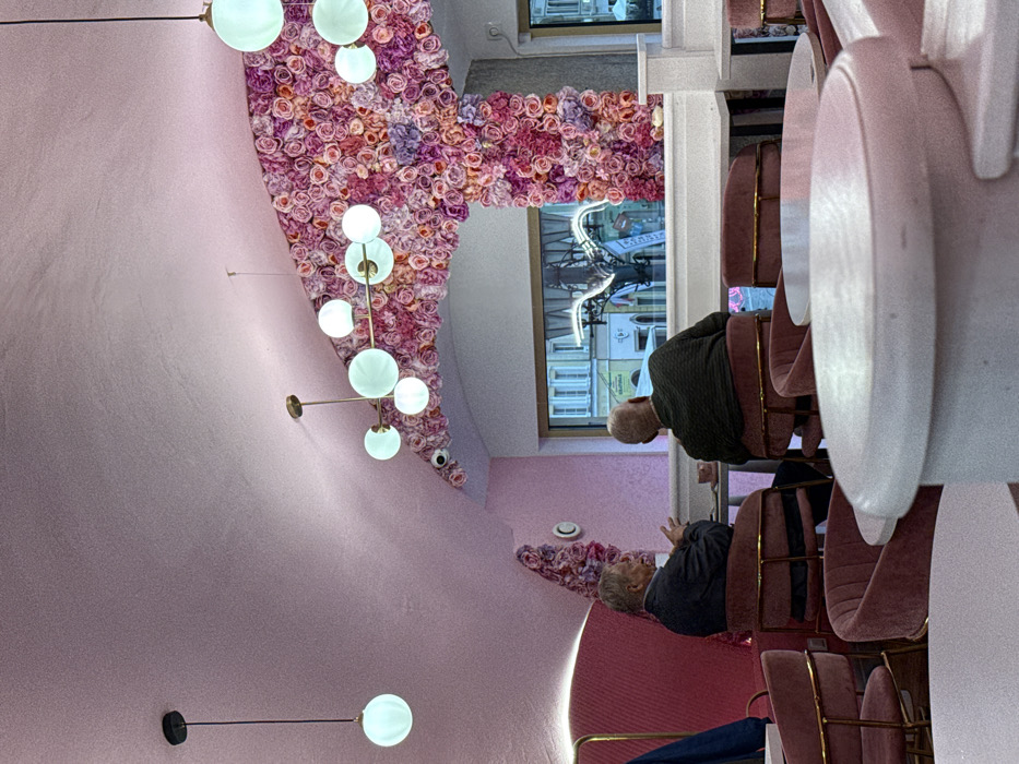 The image captures the interior of a cafe, specifically Słodka Chałupka (Sweet Cottage) located at Rynek 26 in Wrocław, Poland. The establishment features a distinct pink color scheme with textured pink ceilings and a large archway and structural column extensively decorated with artificial pink and purple roses. Illumination is provided by several modern light fixtures, including a single pendant light with a spherical white globe on the left, and a multi-arm brass chandelier-like fixture with five spherical white globes positioned centrally. A compact, dark-colored security camera is discreetly mounted on the ceiling near the rose-covered arch. In the mid-ground, two elderly Caucasian males are seated at a small, light-colored table. The man on the left, with grey hair and wearing a dark jacket over a blue shirt, is engaged in conversation, gesturing with both hands. The man on the right, bald and wearing a dark green sweater, faces the first man, with his back partially to the viewer. A pink cup is visible on their table. Both individuals are seated in pink velvet chairs with gold-colored frames. Through a large window in the background, a view of Wrocław's Market Square is visible. Architectural facades of buildings with numerous windows line the street, and a prominent white "W" sculpture or sign is discernible, along with various streetlights and urban details. The immediate foreground shows blurred white and pink cafe tables, indicating additional seating.