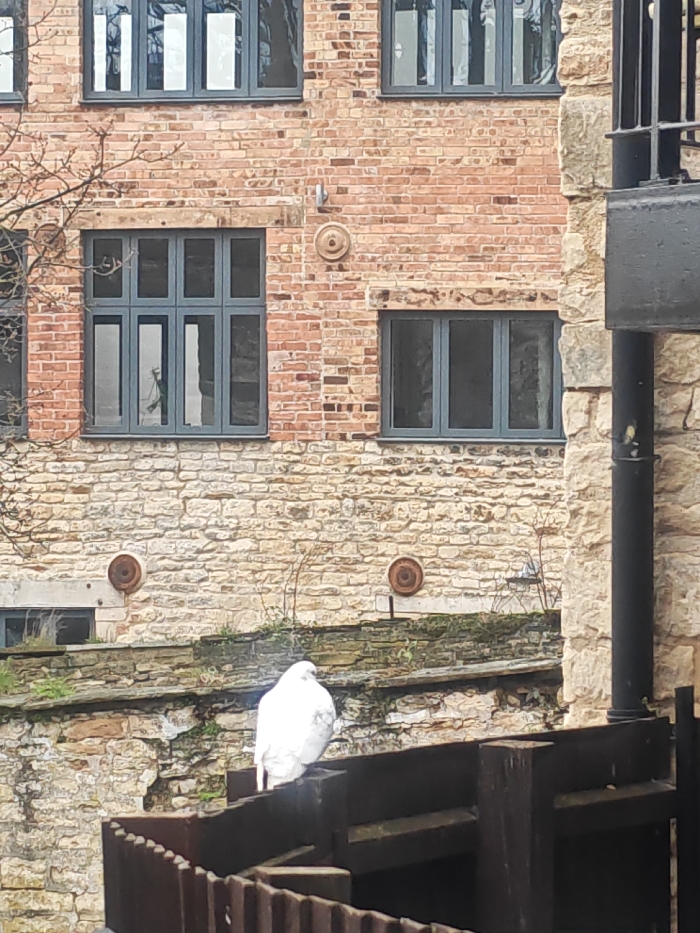 - "The scene depicts an urban environment in South Kesteven, United Kingdom, featuring a white pigeon or dove perched on a dark brown wooden structure in the lower-left foreground" by FM-PpyzL2, licensed under CC BY 4.0