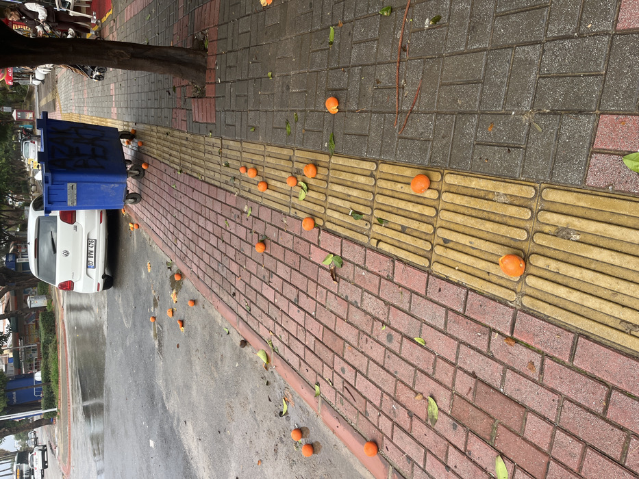 The image displays an urban street scene in Alanya, Antalya Province, Turkey, under overcast conditions following recent precipitation, evidenced by wet asphalt and pavement. The foreground consists of a pedestrian sidewalk constructed from red brick pavers, which transitions to a section of yellow tactile paving for the visually impaired, and then to darker gray rectangular pavers. Numerous whole and partially fragmented oranges, along with scattered green leaves, are strewn across the entire visible sidewalk and extend onto the adjacent asphalt roadway. A white Volkswagen Polo sedan, bearing Turkish license plate 07 BVM 476, is parked on the street with its rear facing the viewer, positioned next to the sidewalk. Adjacent to the parked vehicle, a large, blue, wheeled waste dumpster with visible graffiti is situated on the edge of the asphalt. A tree trunk emerges from the gray pavement section on the far right side of the frame. In the mid-ground, a lone individual, identified as a female wearing a light-colored jacket, is partially visible on the far right, standing near a building entrance, with a dark-colored object resembling a baby stroller positioned nearby. Commercial buildings with storefronts line the street in the background, where other vehicles are also visible.