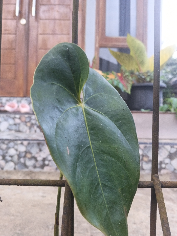 - "A large, dark green, ovate leaf with prominent veins dominates the central foreground, partially obscured by a rusted, dark brown metal grate or fence" by FM-4Pcj22, licensed under CC BY 4.0