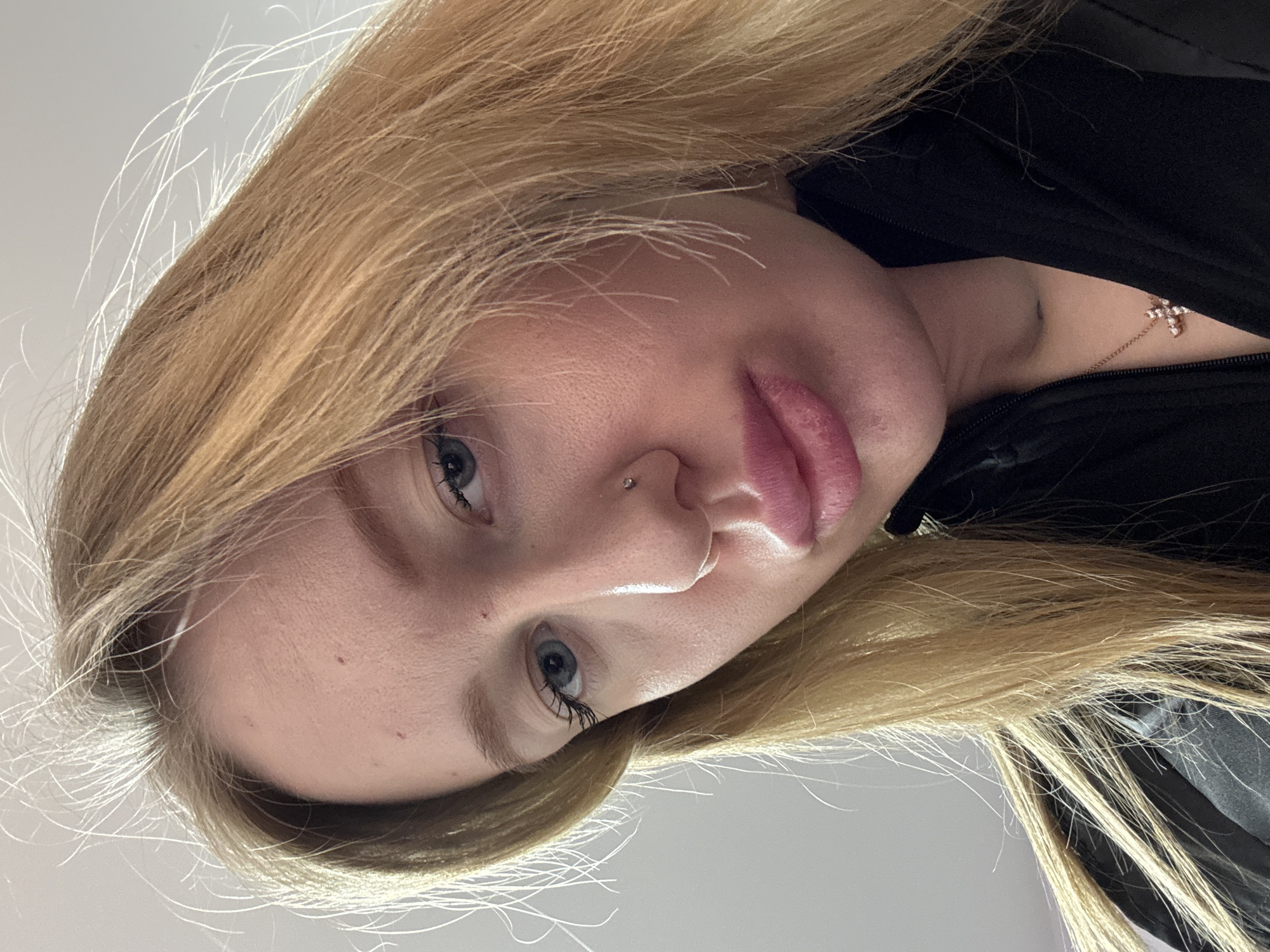A low-angle selfie of a young woman with blonde hair, blue eyes, and a nose piercing