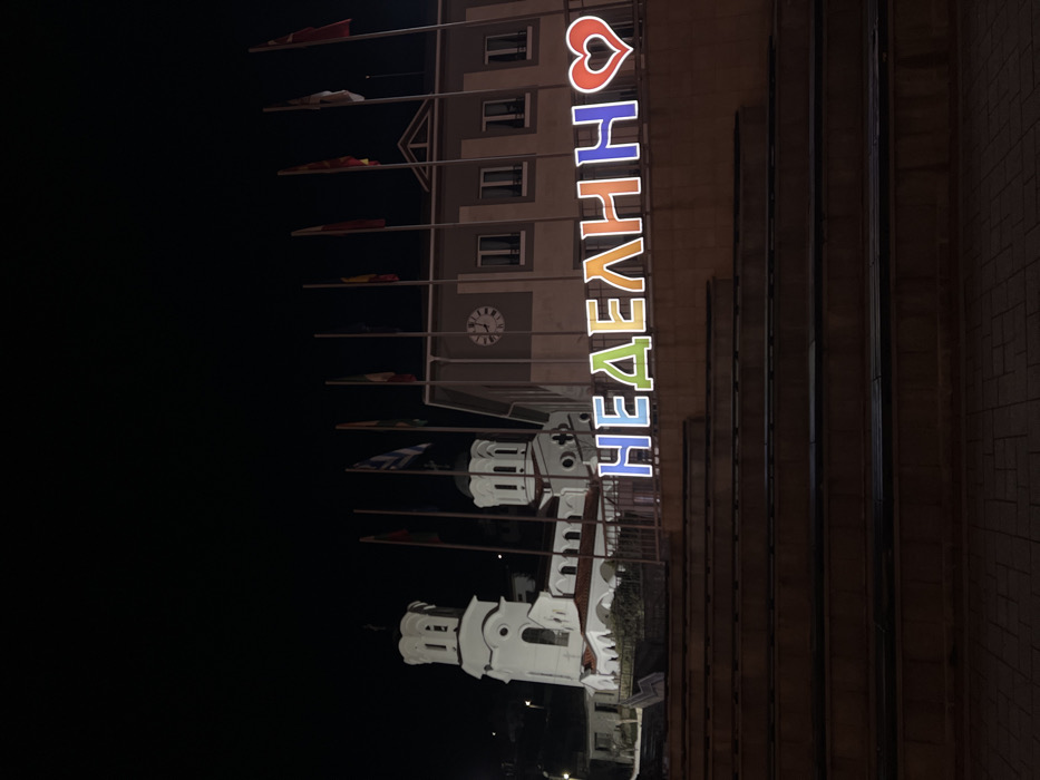 The image displays an illuminated nighttime scene in Nedelino, Bulgaria