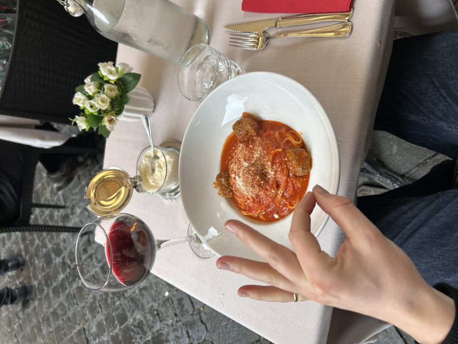 The image depicts an outdoor dining table in Rome, Italy, laden with food and drink. In the foreground, a person's left hand, adorned with a gold wedding band on the ring finger, makes an "OK" gesture, positioned over a white bowl of spaghetti with meatballs in a red marinara sauce, topped with grated white cheese. The person is seated, wearing dark blue jeans, visible below the table. On the light-colored tablecloth, a wine glass filled with red wine stands to the upper left. A metal shaker with a hinged lid containing grated white cheese and a small spoon is next to the wine glass. A small white fluted vase holds a bouquet of white and light pink artificial roses. A clear glass bottle of water with a metal swing-top stopper and ice is to the upper right, alongside a clear glass of water. A set of silverware, consisting of a fork and knife, rests on a red folded napkin to the right of the pasta bowl. The background reveals a blurred cobblestone street and the lower extremities and chairs of other patrons, confirming an outdoor restaurant setting.