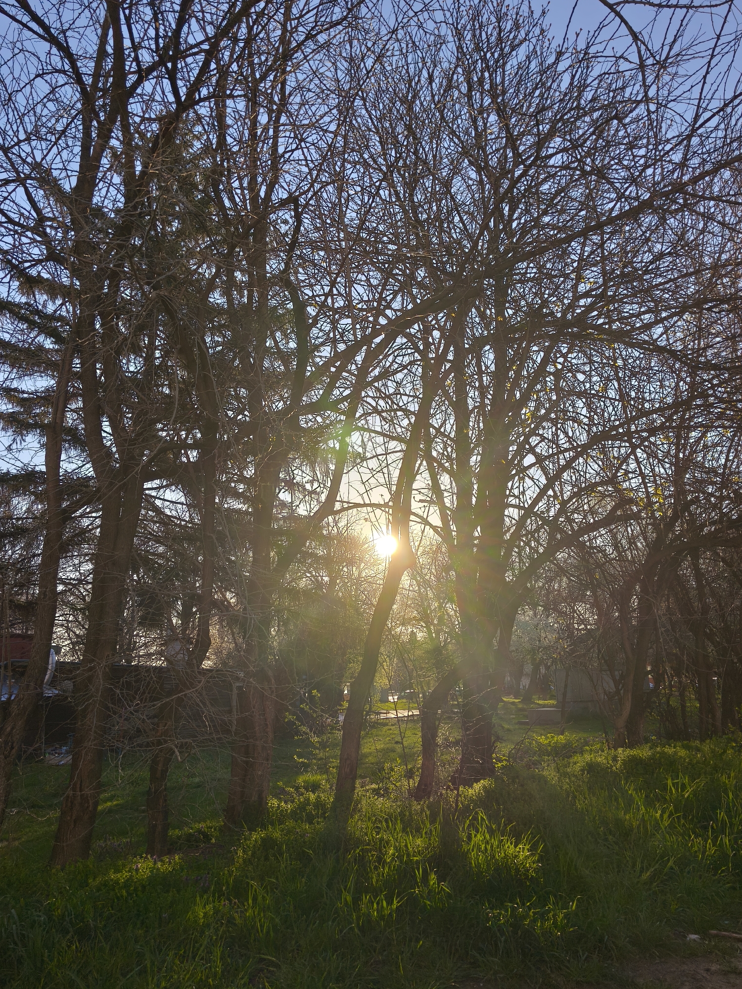 view through trees and grass on a sunny day. The sun is positioned low in the sky, partially obscured by the trees. The branches of the bare trees are silhouetted against the bright sky. The ground is covered with green grass and some other low-lying vegetation. In the background, there are glimpses of buildings and structures, partially obscured by the trees. The location is likely a park or green space in Sofia, Bulgaria, given the type of vegetation and architectural style of the buildings in the background. There are no people visible in the image.