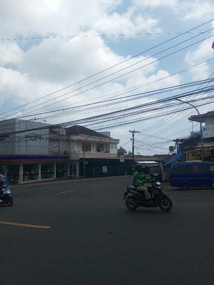 The scene is an urban intersection in Kalchini, India, under a partially cloudy sky. Numerous black electrical and communication wires crisscross overhead. On the left, a multi-story building features a ground floor with large glass storefronts and a blue horizontal accent strip, while the upper floor is clad in gray panels with illegible signage. To its right, a two-story building with light-colored walls and a brown tiled roof stands. A green construction barrier or fence is erected in front of the lower portion of this building. Further right, parts of additional buildings are visible, including one with a blue sign. A dark utility pole supports multiple wires in the mid-ground. The foreground is dominated by a dark asphalt road. A yellow solid line is visible on the far left side of the road, and faint white dashed lines are present further into the intersection. Two motorcycles are depicted. On the right, a person wearing a bright green long-sleeved shirt and a dark helmet is riding a dark-colored scooter/motorcycle, positioned centrally in the road and moving across the frame. On the far left, a second person wearing a light-colored helmet is partially visible on a light blue scooter/motorcycle. In the mid-ground on the right, a blue passenger van is stationary or parked facing left. A smaller, darker blue vehicle is visible behind the green barrier, to the left of the blue van.