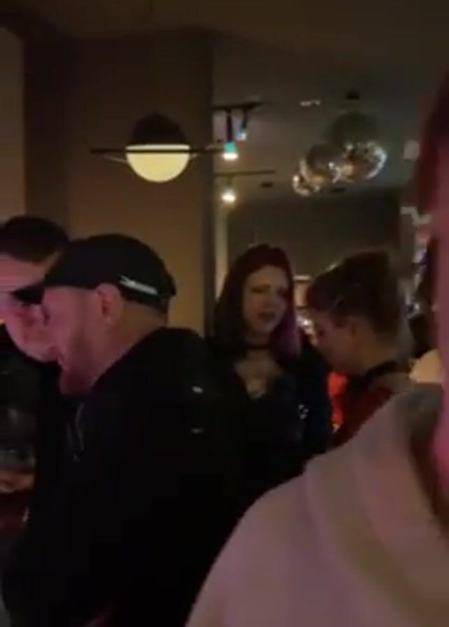 A handheld video shows people socializing in a dark bar-like environment with music playing
